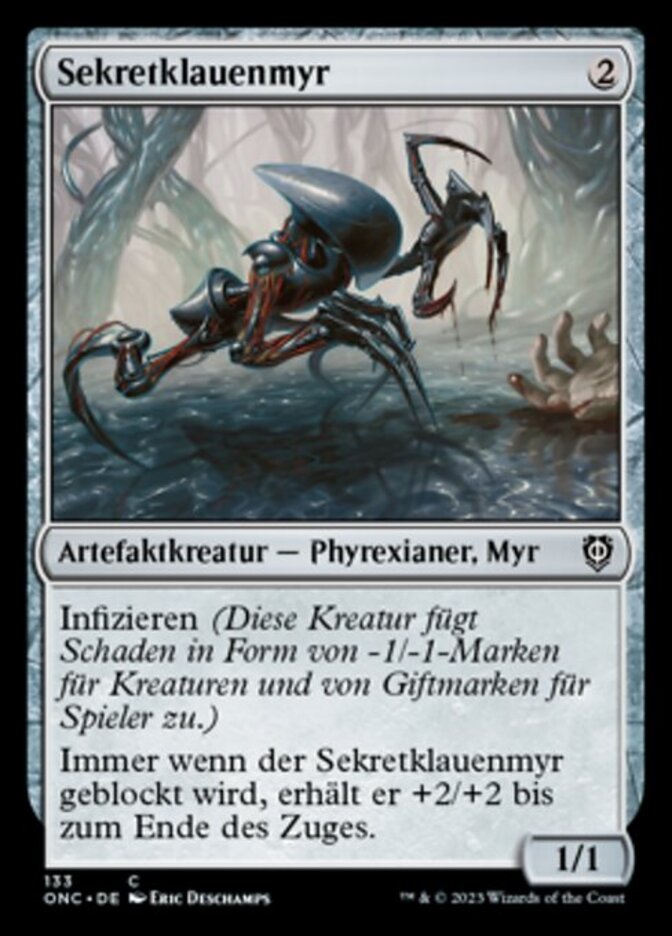 | Rules | Infect (This creature deals damage to creatures in the form of -1/-1 counters and to players in the form of poison counters.) Whenever Ichorclaw Myr becomes blocked, it gets +2/+2 until end of turn. |