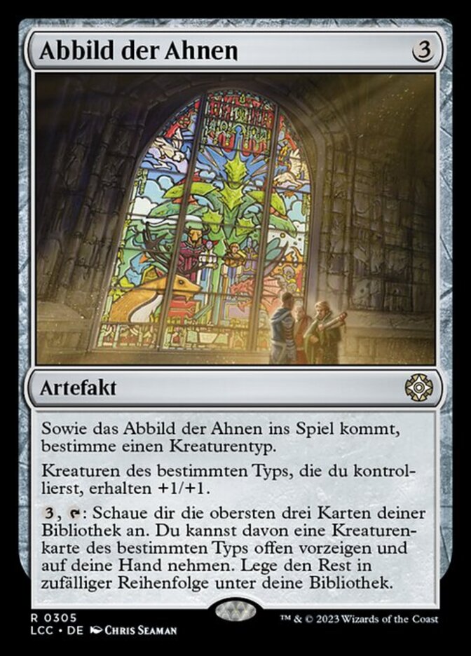 | Rules | As Icon of Ancestry enters the battlefield, choose a creature type. Creatures you control of the chosen type get +1/+1. , : Look at the top three cards of your library. You may reveal a creature card of the chosen type from among them and put it into your hand. Put the rest on the bottom of your library in a random order. |