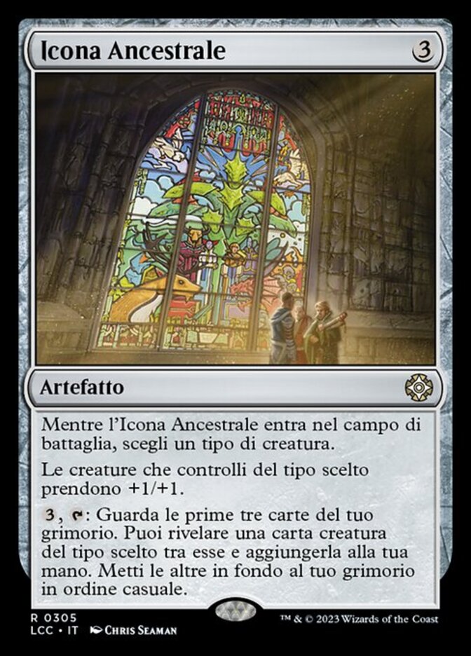 | Rules | As Icon of Ancestry enters the battlefield, choose a creature type. Creatures you control of the chosen type get +1/+1. , : Look at the top three cards of your library. You may reveal a creature card of the chosen type from among them and put it into your hand. Put the rest on the bottom of your library in a random order. |