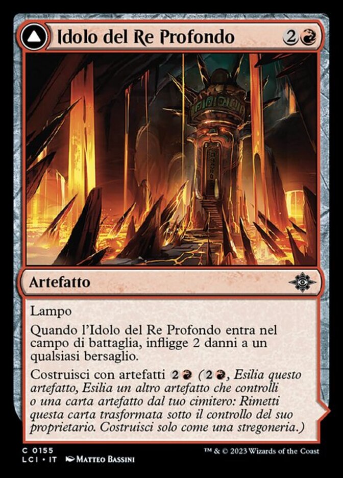 | Rules | Flash When Idol of the Deep King enters the battlefield, it deals 2 damage to any target. Craft with artifact (, Exile this artifact, Exile another artifact you control or an artifact card from your graveyard: Return this card transformed under its owner's control. Craft only as a sorcery.) // When Sovereign's Macuahuitl enters the battlefield, attach it to target creature you control. Equipped creature gets +2/+0. Equip (: Attach to target creature you control. Equip only as a sorcery.) |