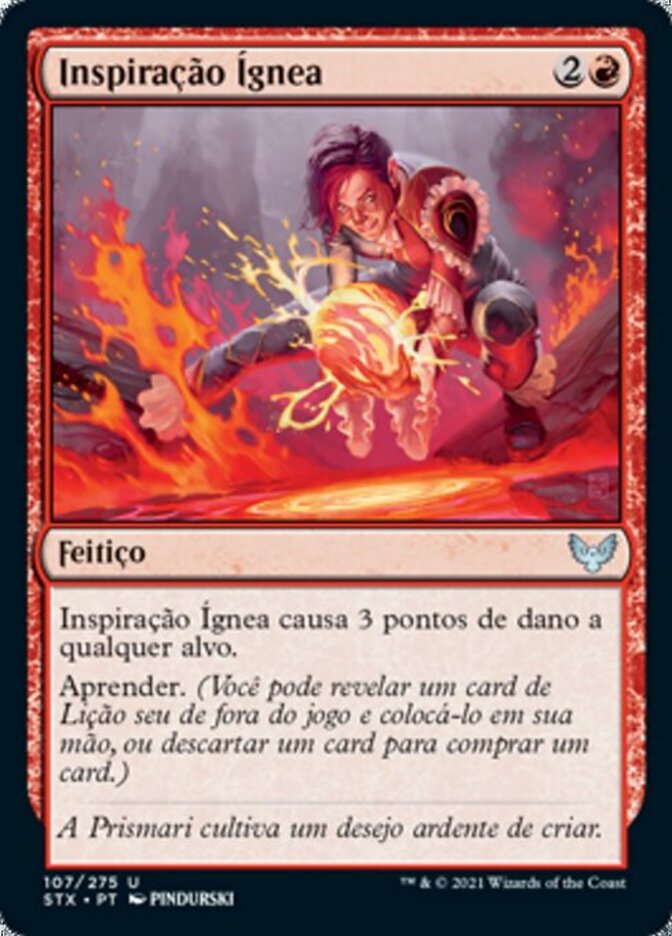 | Rules | Igneous Inspiration deals 3 damage to any target. Learn. (You may reveal a Lesson card you own from outside the game and put it into your hand, or discard a card to draw a card.) |