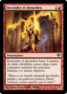 | Rules | Ignite Disorder deals 3 damage divided as you choose among one, two, or three target white and/or blue creatures. |