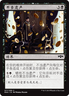 | Rules | At the beginning of your upkeep, Ill-Gotten Inheritance deals 1 damage to each opponent and you gain 1 life. , Sacrifice Ill-Gotten Inheritance: It deals 4 damage to target opponent and you gain 4 life. |
