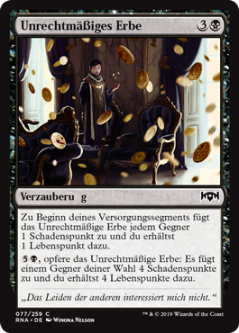 | Rules | At the beginning of your upkeep, Ill-Gotten Inheritance deals 1 damage to each opponent and you gain 1 life. , Sacrifice Ill-Gotten Inheritance: It deals 4 damage to target opponent and you gain 4 life. |