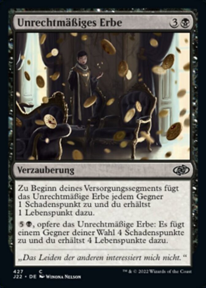 | Rules | At the beginning of your upkeep, Ill-Gotten Inheritance deals 1 damage to each opponent and you gain 1 life. , Sacrifice Ill-Gotten Inheritance: It deals 4 damage to target opponent and you gain 4 life. |