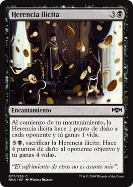 | Rules | At the beginning of your upkeep, Ill-Gotten Inheritance deals 1 damage to each opponent and you gain 1 life. , Sacrifice Ill-Gotten Inheritance: It deals 4 damage to target opponent and you gain 4 life. |