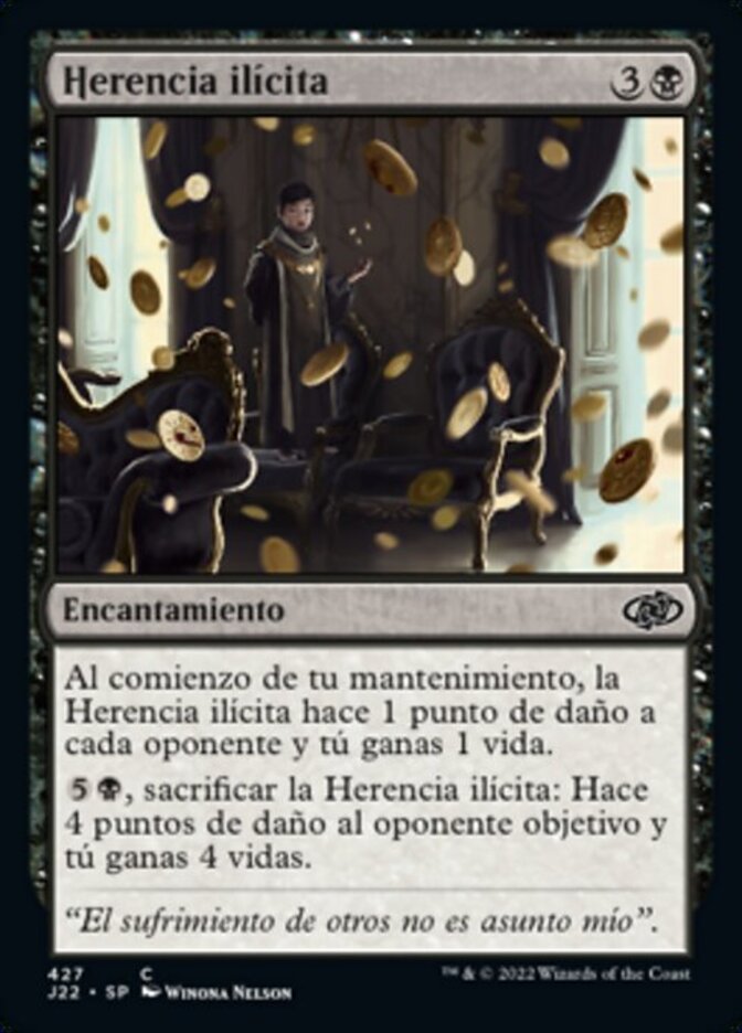 | Rules | At the beginning of your upkeep, Ill-Gotten Inheritance deals 1 damage to each opponent and you gain 1 life. , Sacrifice Ill-Gotten Inheritance: It deals 4 damage to target opponent and you gain 4 life. |