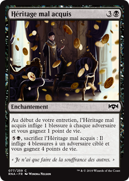 | Rules | At the beginning of your upkeep, Ill-Gotten Inheritance deals 1 damage to each opponent and you gain 1 life. , Sacrifice Ill-Gotten Inheritance: It deals 4 damage to target opponent and you gain 4 life. |