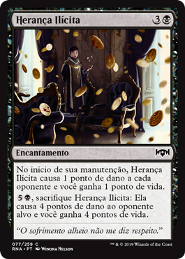 | Rules | At the beginning of your upkeep, Ill-Gotten Inheritance deals 1 damage to each opponent and you gain 1 life. , Sacrifice Ill-Gotten Inheritance: It deals 4 damage to target opponent and you gain 4 life. |