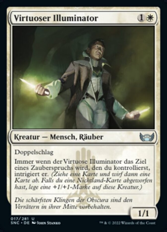 | Rules | Double strike Whenever Illuminator Virtuoso becomes the target of a spell you control, it connives. (Draw a card, then discard a card. If you discarded a nonland card, put a +1/+1 counter on this creature.) |