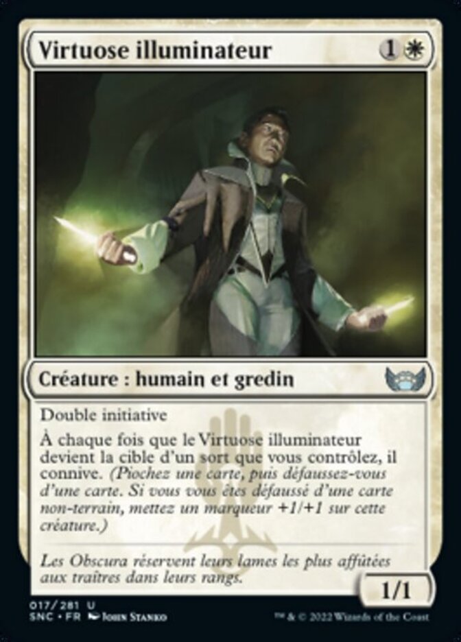 | Rules | Double strike Whenever Illuminator Virtuoso becomes the target of a spell you control, it connives. (Draw a card, then discard a card. If you discarded a nonland card, put a +1/+1 counter on this creature.) |