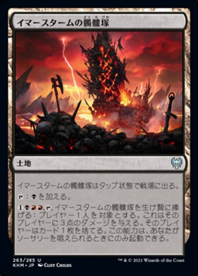 | Rules | Immersturm Skullcairn enters the battlefield tapped. : Add . , , Sacrifice Immersturm Skullcairn: It deals 3 damage to target player. That player discards a card. Activate only as a sorcery. |