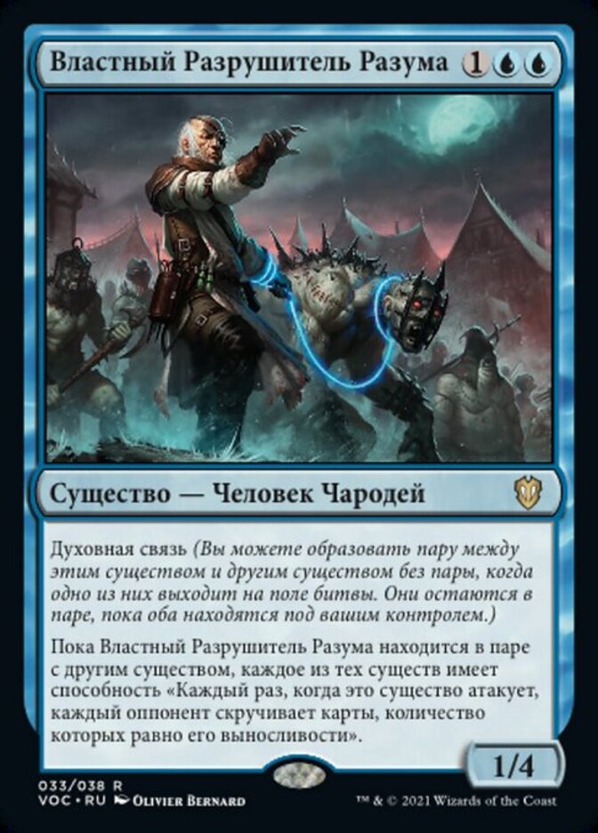 | Rules | Soulbond (You may pair this creature with another unpaired creature when either enters the battlefield. They remain paired for as long as you control both of them.) As long as Imperious Mindbreaker is paired with another creature, each of those creatures has "Whenever this creature attacks, each opponent mills cards equal to its toughness." |