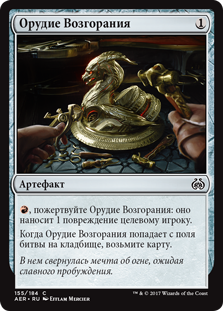 | Rules | , Sacrifice Implement of Combustion: It deals 1 damage to target player or planeswalker. When Implement of Combustion is put into a graveyard from the battlefield, draw a card. |