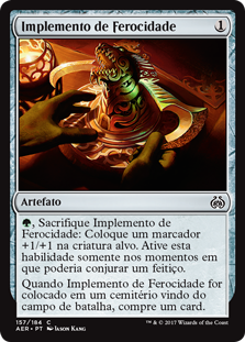 | Rules | , Sacrifice Implement of Ferocity: Put a +1/+1 counter on target creature. Activate only as a sorcery. When Implement of Ferocity is put into a graveyard from the battlefield, draw a card. |