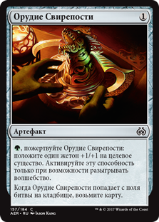 | Rules | , Sacrifice Implement of Ferocity: Put a +1/+1 counter on target creature. Activate only as a sorcery. When Implement of Ferocity is put into a graveyard from the battlefield, draw a card. |