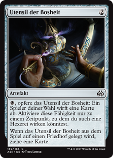 | Rules | , Sacrifice Implement of Malice: Target player discards a card. Activate only as a sorcery. When Implement of Malice is put into a graveyard from the battlefield, draw a card. |