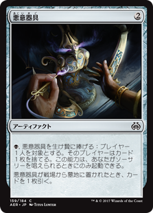 | Rules | , Sacrifice Implement of Malice: Target player discards a card. Activate only as a sorcery. When Implement of Malice is put into a graveyard from the battlefield, draw a card. |