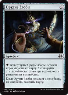 | Rules | , Sacrifice Implement of Malice: Target player discards a card. Activate only as a sorcery. When Implement of Malice is put into a graveyard from the battlefield, draw a card. |