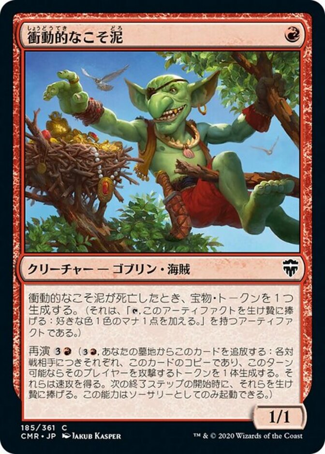 | Rules | When Impulsive Pilferer dies, create a Treasure token. (It's an artifact with ", Sacrifice this artifact: Add one mana of any color.") Encore (, Exile this card from your graveyard: For each opponent, create a token copy that attacks that opponent this turn if able. They gain haste. Sacrifice them at the beginning of the next end step. Activate only as a sorcery.) |