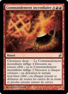 | Rules | Choose two — • Incendiary Command deals 4 damage to target player or planeswalker. • Incendiary Command deals 2 damage to each creature. • Destroy target nonbasic land. • Each player discards all the cards in their hand, then draws that many cards. |