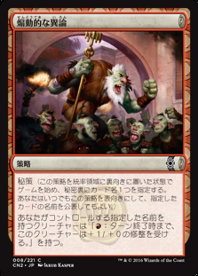 | Rules | Hidden agenda (Start the game with this conspiracy face down in the command zone and secretly choose a card name. You may turn this conspiracy face up any time and reveal that name.) Creatures you control with the chosen name have ": This creature gets +1/+0 until end of turn." |