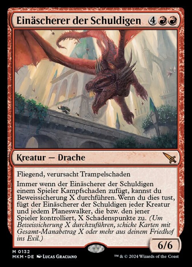 | Rules | Flying, trample Whenever Incinerator of the Guilty deals combat damage to a player, you may collect evidence X. When you do, Incinerator of the Guilty deals X damage to each creature and each planeswalker that player controls. (To collect evidence X, exile cards with total mana value X or greater from your graveyard.) |