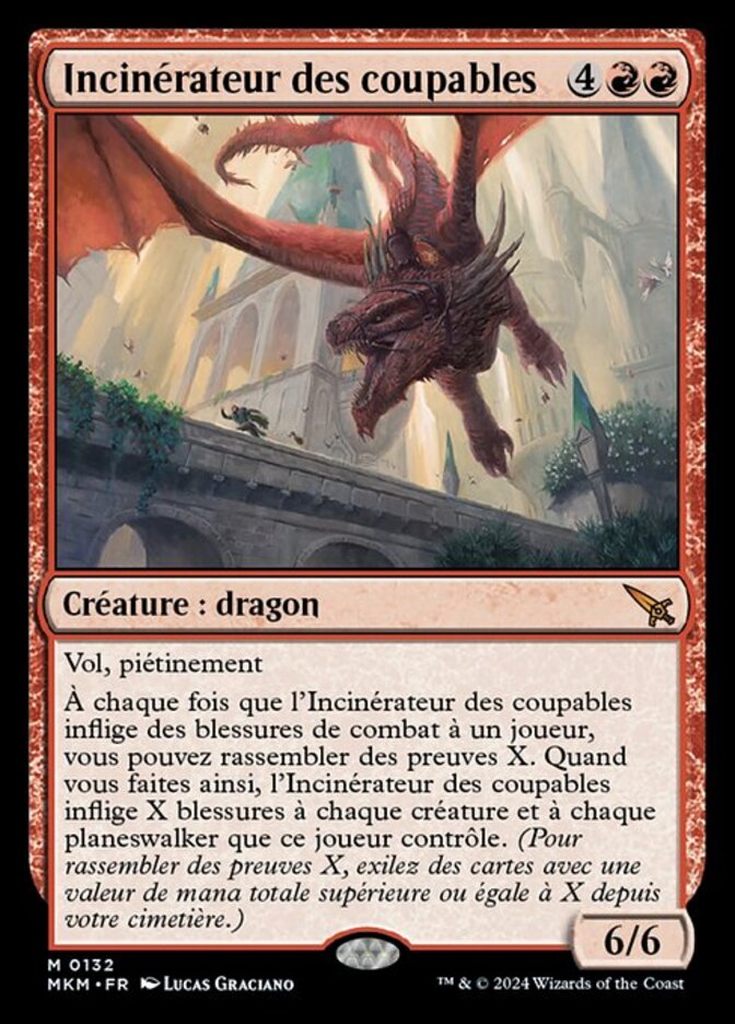 | Rules | Flying, trample Whenever Incinerator of the Guilty deals combat damage to a player, you may collect evidence X. When you do, Incinerator of the Guilty deals X damage to each creature and each planeswalker that player controls. (To collect evidence X, exile cards with total mana value X or greater from your graveyard.) |