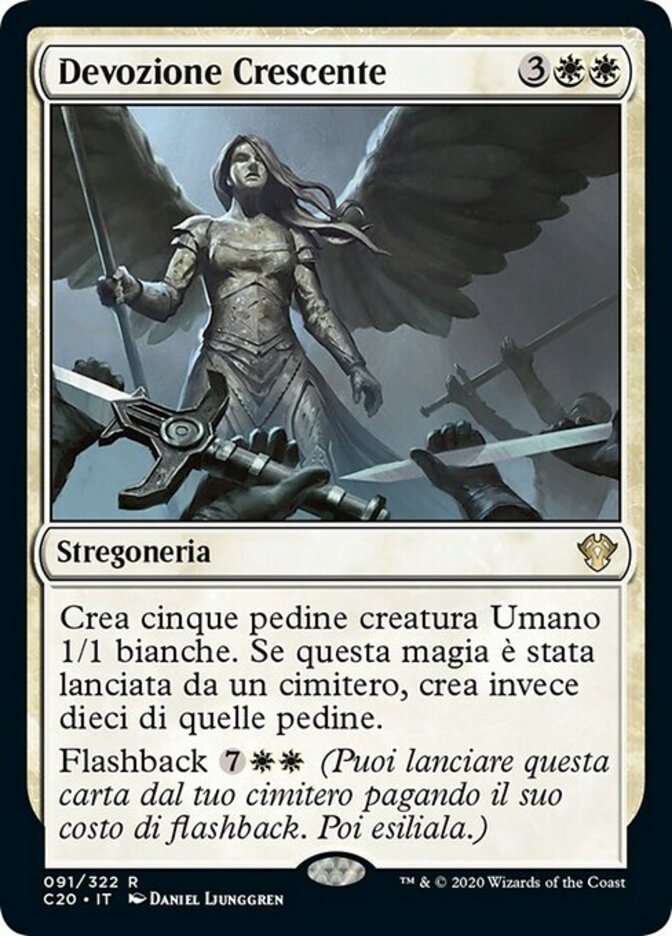 | Rules | Create five 1/1 white Human creature tokens. If this spell was cast from a graveyard, create ten of those tokens instead. Flashback (You may cast this card from your graveyard for its flashback cost. Then exile it.) |