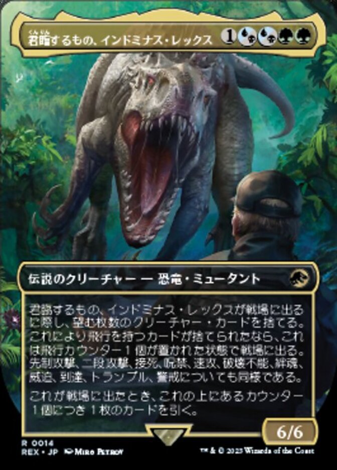 | Rules | As Indominus Rex, Alpha enters the battlefield, discard any number of creature cards. It enters with a flying counter on it if a card discarded this way has flying. The same is true for first strike, double strike, deathtouch, hexproof, haste, indestructible, lifelink, menace, reach, trample, and vigilance. When Indominus Rex enters the battlefield, draw a card for each counter on it. |