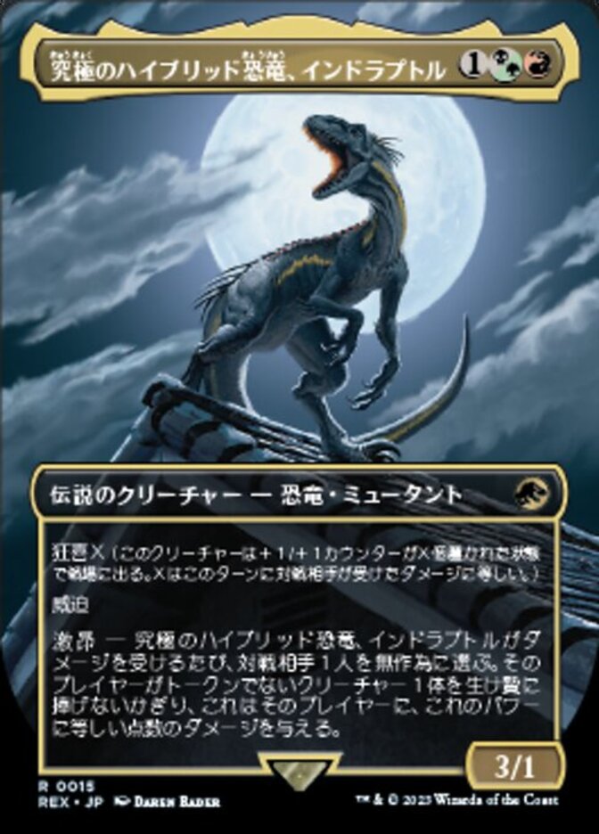 | Rules | Bloodthirst X (This creature enters the battlefield with X +1/+1 counters on it, where X is the damage dealt to your opponents this turn.) Menace Enrage — Whenever Indoraptor, the Perfect Hybrid is dealt damage, choose an opponent at random. Indoraptor deals damage equal to its power to that player unless they sacrifice a nontoken creature. |