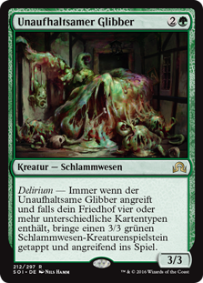 | Rules | Delirium — Whenever Inexorable Blob attacks, if there are four or more card types among cards in your graveyard, create a 3/3 green Ooze creature token that's tapped and attacking. |