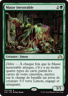 | Rules | Delirium — Whenever Inexorable Blob attacks, if there are four or more card types among cards in your graveyard, create a 3/3 green Ooze creature token that's tapped and attacking. |