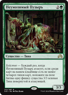 | Rules | Delirium — Whenever Inexorable Blob attacks, if there are four or more card types among cards in your graveyard, create a 3/3 green Ooze creature token that's tapped and attacking. |