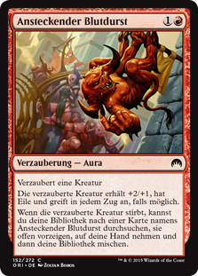 | Rules | Enchant creature Enchanted creature gets +2/+1, has haste, and attacks each combat if able. When enchanted creature dies, you may search your library for a card named Infectious Bloodlust, reveal it, put it into your hand, then shuffle. |