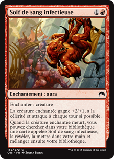 | Rules | Enchant creature Enchanted creature gets +2/+1, has haste, and attacks each combat if able. When enchanted creature dies, you may search your library for a card named Infectious Bloodlust, reveal it, put it into your hand, then shuffle. |