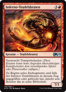 | Rules | Trample (This creature can deal excess combat damage to the player or planeswalker it's attacking.) At the beginning of each end step, if Inferno Hellion attacked or blocked this turn, its owner shuffles it into their library. |
