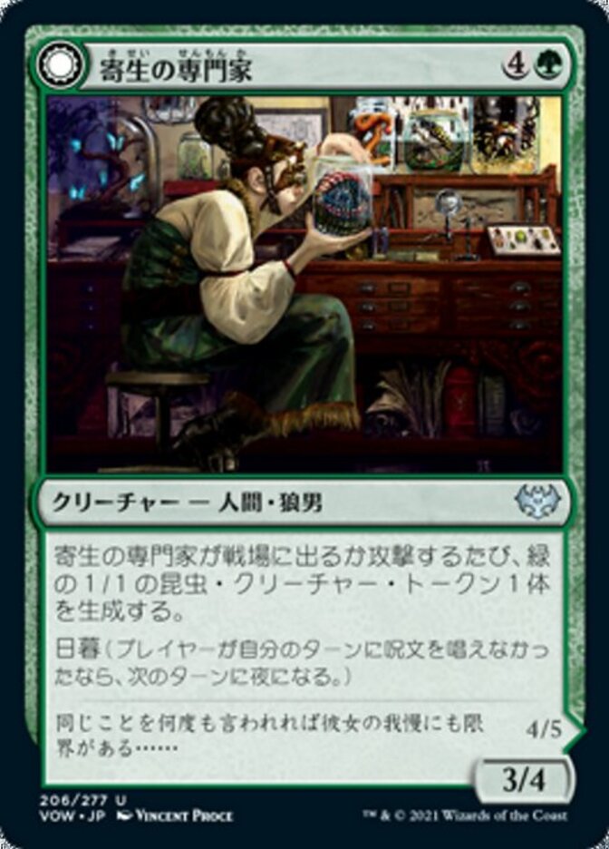 | Rules | Whenever Infestation Expert enters the battlefield or attacks, create a 1/1 green Insect creature token. Daybound (If a player casts no spells during their own turn, it becomes night next turn.) // Whenever Infested Werewolf enters the battlefield or attacks, create two 1/1 green Insect creature tokens. Nightbound (If a player casts at least two spells during their own turn, it becomes day next turn.) |