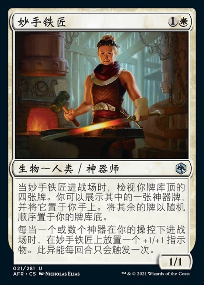 | Rules | When Ingenious Smith enters the battlefield, look at the top four cards of your library. You may reveal an artifact card from among them and put it into your hand. Put the rest on the bottom of your library in a random order. Whenever one or more artifacts enter the battlefield under your control, put a +1/+1 counter on Ingenious Smith. This ability triggers only once each turn. |