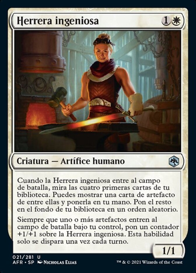 | Rules | When Ingenious Smith enters the battlefield, look at the top four cards of your library. You may reveal an artifact card from among them and put it into your hand. Put the rest on the bottom of your library in a random order. Whenever one or more artifacts enter the battlefield under your control, put a +1/+1 counter on Ingenious Smith. This ability triggers only once each turn. |