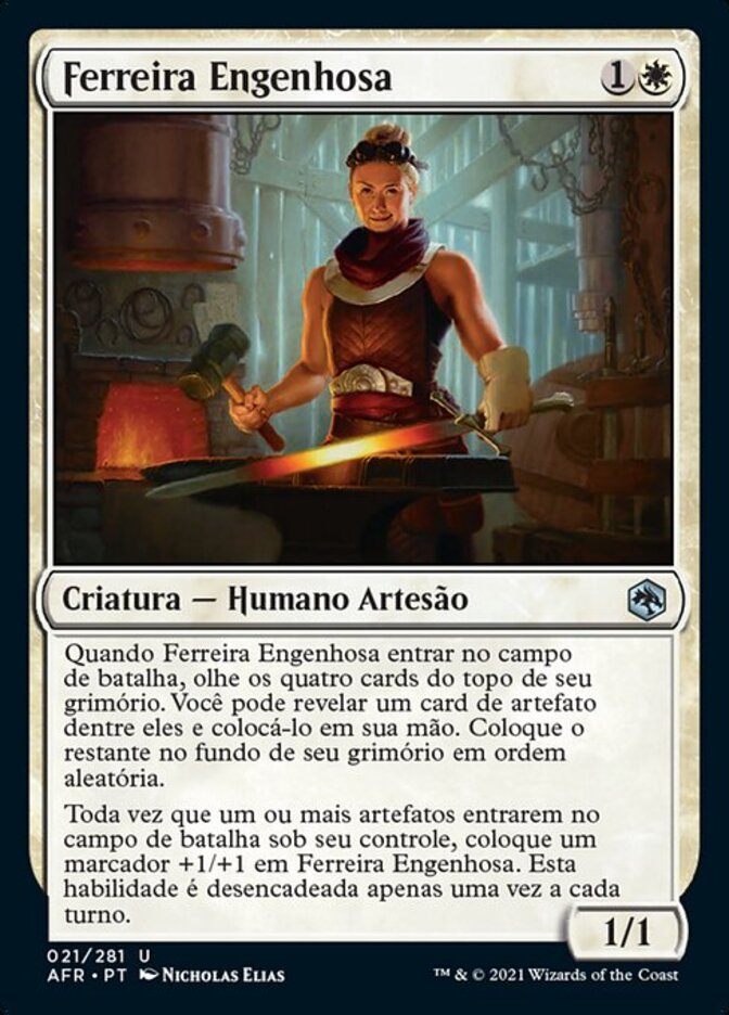 | Rules | When Ingenious Smith enters the battlefield, look at the top four cards of your library. You may reveal an artifact card from among them and put it into your hand. Put the rest on the bottom of your library in a random order. Whenever one or more artifacts enter the battlefield under your control, put a +1/+1 counter on Ingenious Smith. This ability triggers only once each turn. |