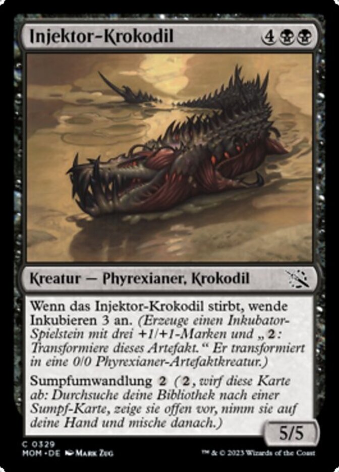 | Rules | When Injector Crocodile dies, incubate 3. (Create an Incubator token with three +1/+1 counters on it and ": Transform this artifact." It transforms into a 0/0 Phyrexian artifact creature.) Swampcycling (, Discard this card: Search your library for a Swamp card, reveal it, put it into your hand, then shuffle.) |