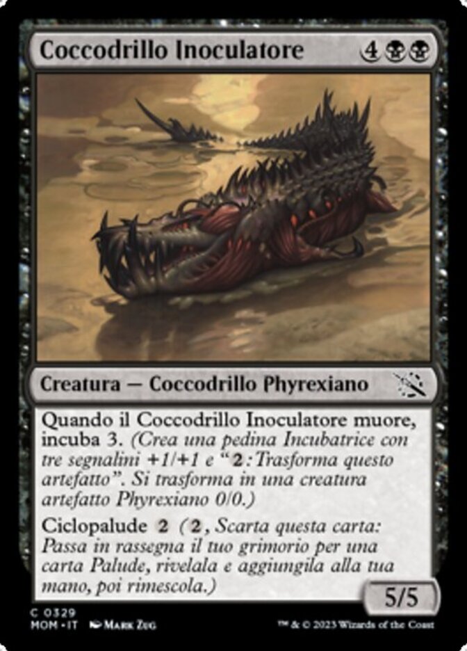 | Rules | When Injector Crocodile dies, incubate 3. (Create an Incubator token with three +1/+1 counters on it and ": Transform this artifact." It transforms into a 0/0 Phyrexian artifact creature.) Swampcycling (, Discard this card: Search your library for a Swamp card, reveal it, put it into your hand, then shuffle.) |