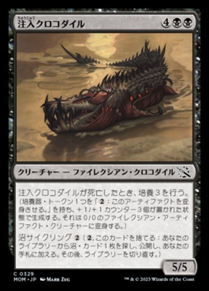 | Rules | When Injector Crocodile dies, incubate 3. (Create an Incubator token with three +1/+1 counters on it and ": Transform this artifact." It transforms into a 0/0 Phyrexian artifact creature.) Swampcycling (, Discard this card: Search your library for a Swamp card, reveal it, put it into your hand, then shuffle.) |