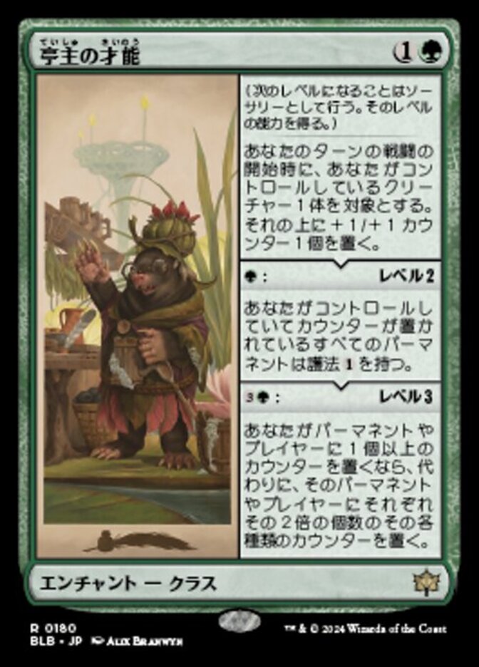 | Rules | (Gain the next level as a sorcery to add its ability.) At the beginning of combat on your turn, put a +1/+1 counter on target creature you control. : Level 2 Permanents you control with counters on them have ward . : Level 3 If you would put one or more counters on a permanent or player, put twice that many of each of those kinds of counters on that permanent or player instead. |