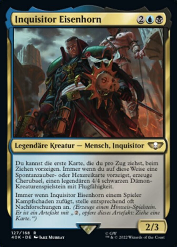 | Rules | You may reveal the first card you draw each turn as you draw it. Whenever you reveal an instant or sorcery card this way, create Cherubael, a legendary 4/4 black Demon creature token with flying. Whenever Inquisitor Eisenhorn deals combat damage to a player, investigate that many times. (Create a Clue token. It's an artifact with ", Sacrifice this artifact: Draw a card.") |