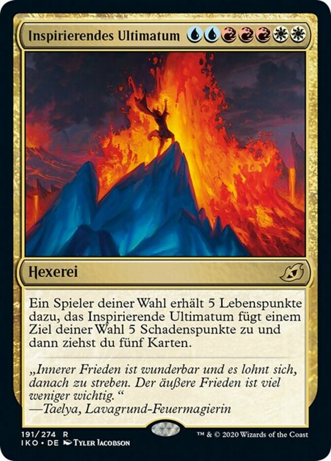 | Rules | Target player gains 5 life, Inspired Ultimatum deals 5 damage to any target, then you draw five cards. |