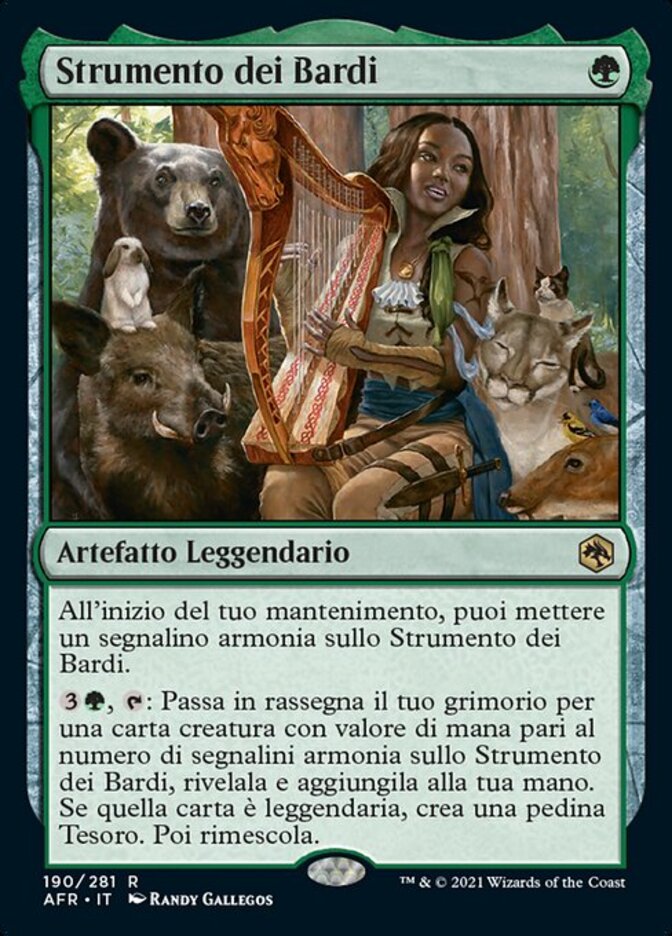 | Rules | At the beginning of your upkeep, you may put a harmony counter on Instrument of the Bards. , : Search your library for a creature card with mana value equal to the number of harmony counters on Instrument of the Bards, reveal it, and put it into your hand. If that card is legendary, create a Treasure token. Then shuffle. |