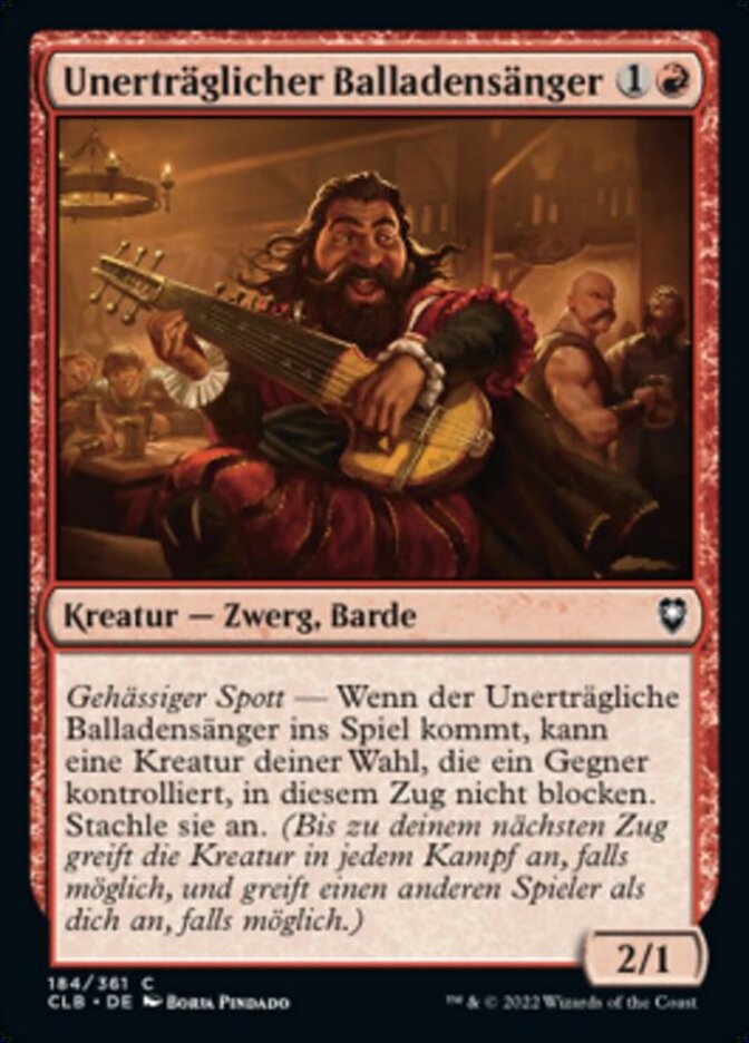 | Rules | Vicious Mockery — When Insufferable Balladeer enters the battlefield, target creature an opponent controls can't block this turn. Goad it. (Until your next turn, that creature attacks each combat if able and attacks a player other than you if able.) |