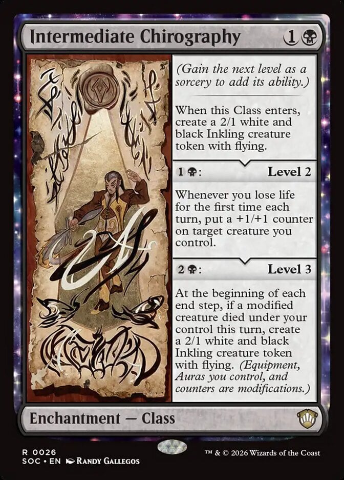 | Rules | (Gain the next level as a sorcery to add its ability.) When this Class enters, create a 2/1 white and black Inkling creature token with flying. : Level 2 Whenever you lose life for the first time each turn, put a +1/+1 counter on target creature you control. : Level 3 At the beginning of each end step, if a modified creature died under your control this turn, create a 2/1 white and black Inkling creature token with flying. (Equipment, Auras you control, and counters are modifications.) |